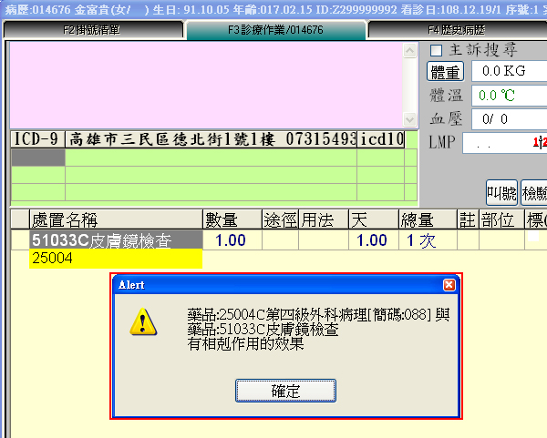 (2)功能說明:同病患同項目於「療程日限」未完前鍵入相同處置時即會出現如下提醒