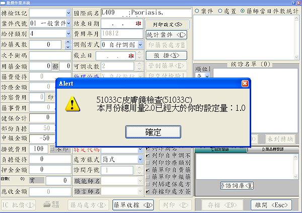 (1)功能說明:同病患同項目「當月最大用量」超過設定次數,於批價作業存檔時即會出現如下提醒