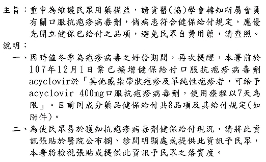 重申為維護民眾用藥權益,倘病患符合口服抗疱疹病毒劑健保給付規定,應優先開立健保已給付之品項,避免民眾自費用藥