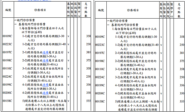 更版說明:健保署重申開具慢性病(連續)處方申報定義,為開立調劑次數2次以上且給藥日數7天以上28天以下之連續處方箋方使用此類診察費申報代碼,非指一般慢性病給藥案件(04案件),本版次以上修改為健保署重申定義申報方式,非連續處方箋之開立藥品處方案件不論使用09或04案件申報診察費無點數差異,以申報門診合理量第一段無特殊加成情況下為例皆為358點(精神科為344點)!