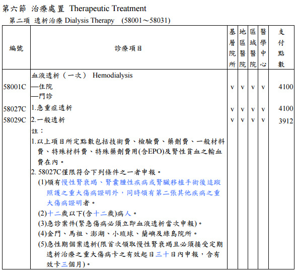 (三)第六節治療處置:修正「血液透析(一次)—門診 1.急重症透析」(編號 58027C)支付規範。