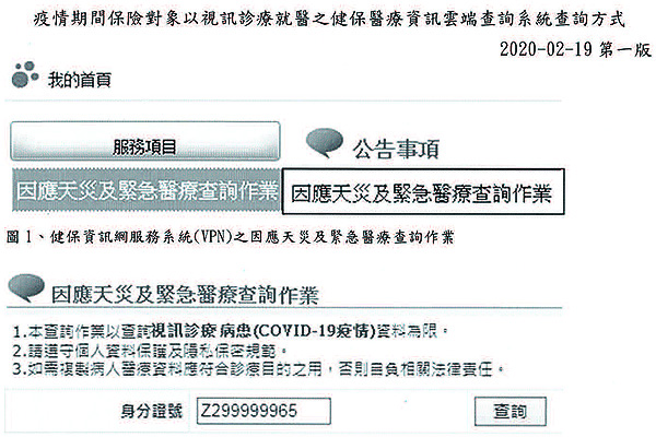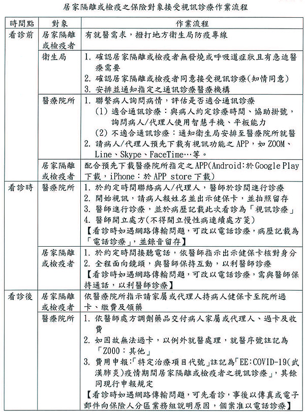 公告「全民健康保險特約醫事服務機構提供因COVID-19(武漢肺炎)疫情接受居家隔離或檢疫之保險對象視訊診療作業須知」