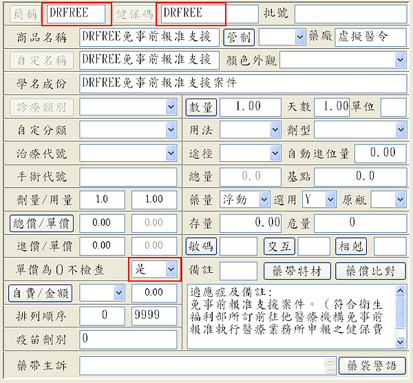 簡稱欄位可自定,健保碼欄位請輸入「DRFREE」再按下『ENTER』鍵帶出預設資料