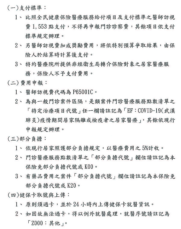 公告「全民健康保險特約醫事服務機構提供因COVID-19(武漢肺炎)疫情接受居家隔離或居家檢疫之保險對象居家醫療作業須知」
