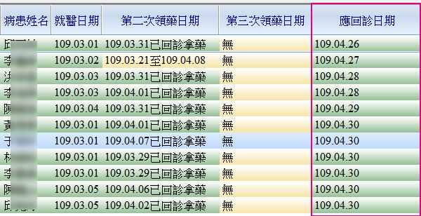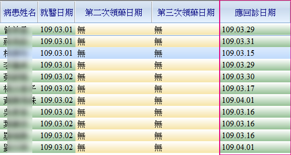 ● 點選抬頭列各項欄位名稱,如『應回診日期』(紅框處)皆可執行日期排序