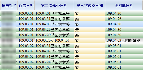 第二次領藥日期/第三次領藥日期/應回診日期/病名/總給藥日數/調劑次數/調劑方式/病患電話』