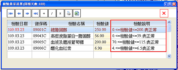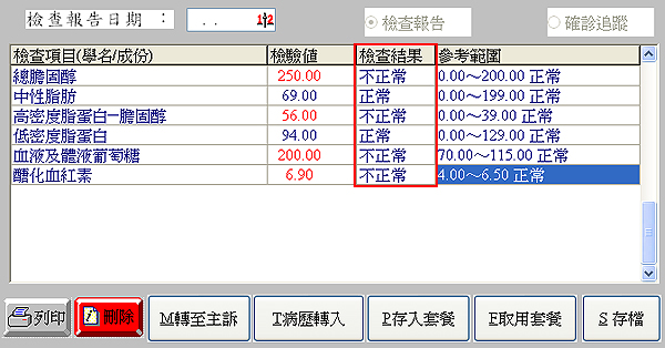 系統會依據檢查項目設定範圍值自動判別結果為正常或不正常,不正常值會顯示紅字以利提醒