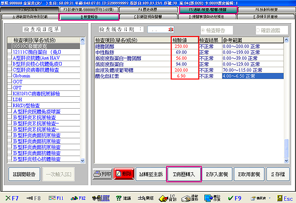 設定好檢驗報告參考值範圍的項目,於『B檢查報告』畫面鍵入檢驗結果值時