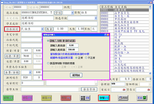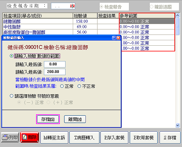 開啟『檢驗值的輸入』視窗,將該檢驗報告參考範圍值輸入完畢,按下『離開T』再按『F9存檔』即可