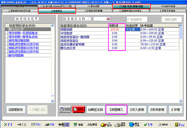『F3診療作業』有開立檢驗資料時,點選『T 病歷轉入』當日檢驗項目即自動轉至檢查報告畫面內