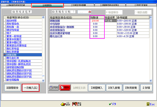 於左方的「檢查項目選單」上點選要輸入的檢查項目(呈紅勾),然後點選『一次輸入[K]』
