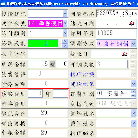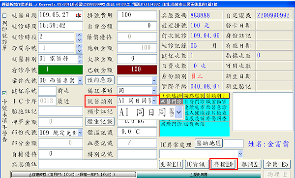 1. 就醫類別點選『AI 同日同醫師』;部份代號會自動跳成『009 規定免部分負擔』,再按下『存檔F9』