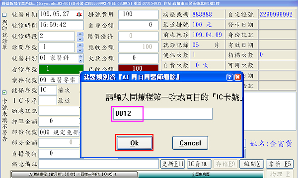 2. 出現「請輸入同療程第一次或同日的IC卡號」登打視窗,請鍵入首次就醫序號,如『0012』再按下「Ok」