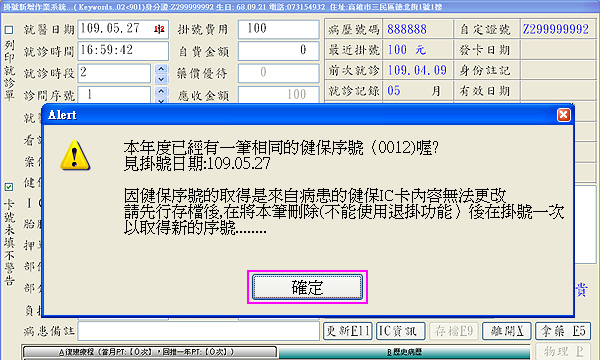 3. 接著出現『本年度已經有一筆相同的健保序號(0012)喔?見掛號日期:109.05.27』的提醒視窗,