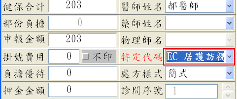(二)居定個案所須藥品,由貴診所提供調劑與送藥服務或由家屬持健保卡及處方箋至貴診所調劑領藥,亦應於任一特定治療項目代號填報EC,另診察費已內含於醫師訪視費,應不得重複申報。