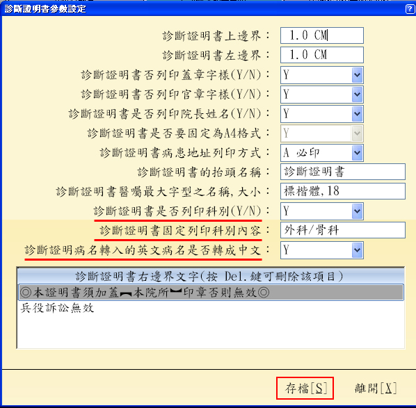 再移至「開啟診斷書參數設定編輯」按下即可出現「診斷證明書參數設定」編輯視窗