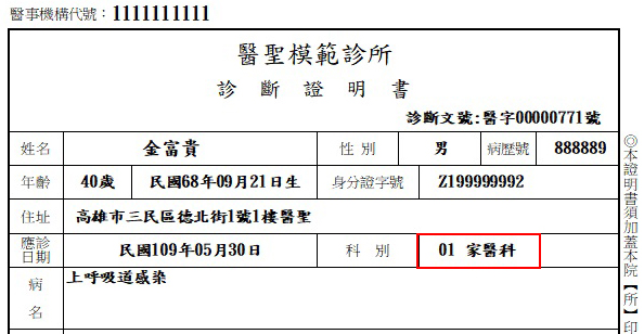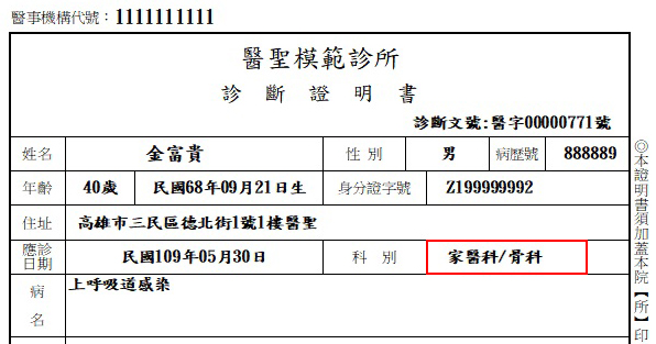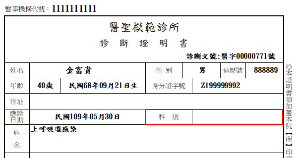 診斷證明書固定列印科別內容: