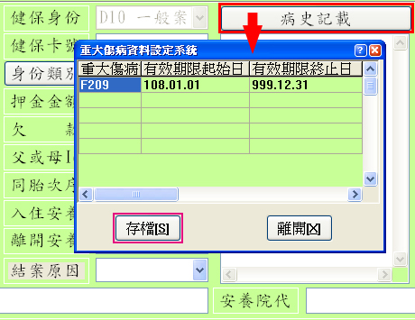 重大傷病代碼輸入說明:於『病患資料』內『病史記載』的功能按鍵上單擊左鍵一下,會顯示『重大傷病資料設定系統』請在畫面的欄位內輸入相關資料,然後按下『存檔[S]』。註:在『起始日與終止日』的欄位上按滑鼠右鍵會顯示日期選單!