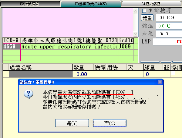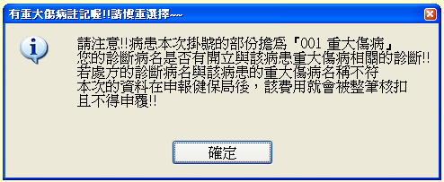 功能說明:當『病患資料』內『重大傷病資料設定系統』有設定重大傷病代碼及期限時,若該病患掛號時『部份代號』為『001重大傷病』,當次病歷內若未開立到系統已建立的相關重大傷病代碼時,會出現如下圖提醒視窗