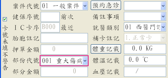 【醫管規定:若申報案件部分負擔代碼為001重大傷病時,當次申報病歷需有相關重大病名代碼,否則申報病名不符重大傷病病名,事後會核減免收部分負擔金額。】