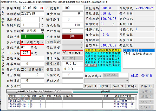 ├ 健保IC卡掛號畫面:確認B7戒菸門診案件掛入時『就醫類別』為『AC 預防保健』(非CA)