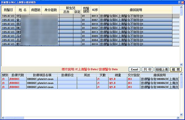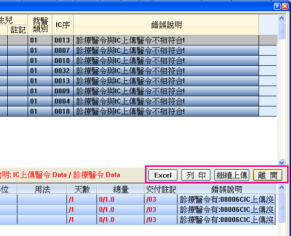 ● 不相符醫令明細可轉出「EXCEL」或直接「列印」出來查閱或按下「繼續上傳」完成上傳