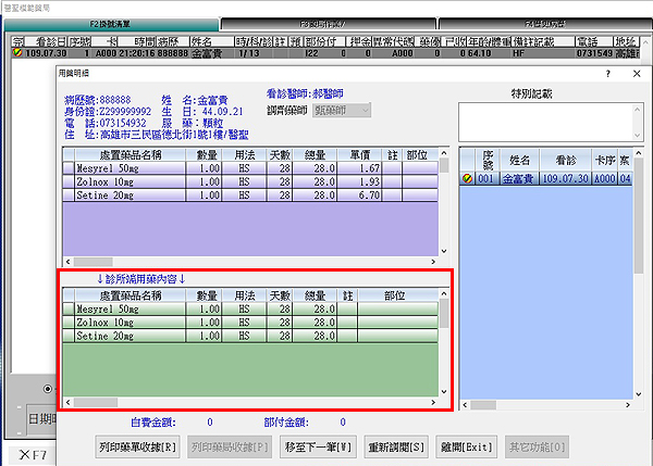 操作說明:於F2掛號清單畫面,按下滑鼠右鍵,可顯示「用藥明細」資料