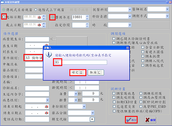 出現詢問「請輸入健檢的時程代碼」,輸入腸篩申報時程代碼「85」,再按下「確定」