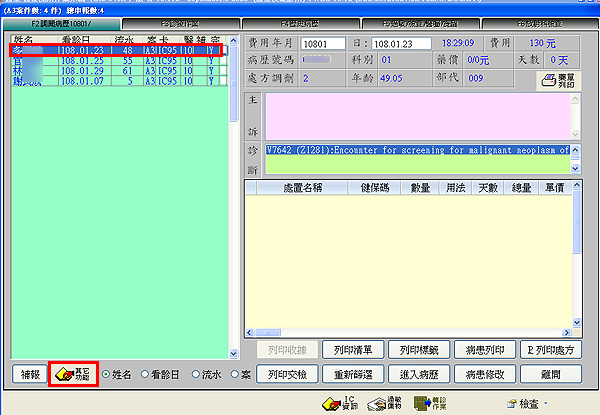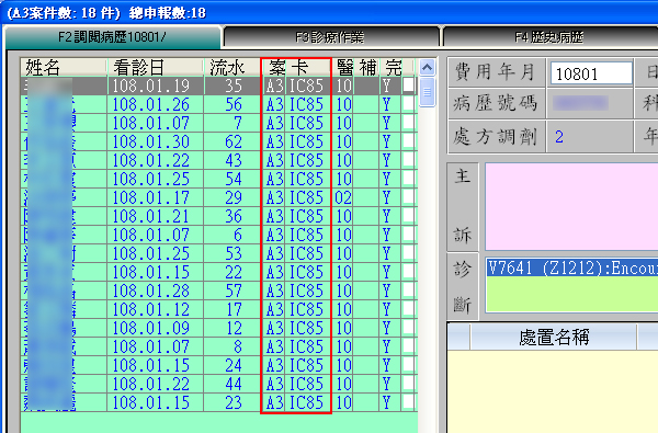 直接於掛號或診療清單畫面,或於上圖調閱筆數,滑鼠左鍵點選該筆A3預防保健掛號資料(反藍),