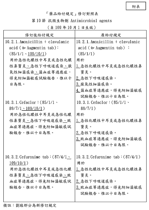 公告事項:修訂「全民健康保險藥物給付項目及支付標準-第6編第83條之藥品給付規定第10節 抗微生物劑 Antimicrobial agents 10.2.1.Amoxicillin + clavulanic acid(如Augmentin tab)、10.3.1.Cefaclor及10.3.2.Cefuroxime tab」部分規定,給付規定修訂對照表如附件(附件電子檔已置於本署全球資訊網([連結]),路徑為:首頁>健保法令>最新全民健保法規公告,請自行下載)