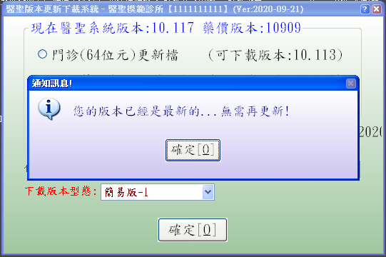 4. 若點選執行『醫聖自動更新管理』回復以下訊息,表示目前使用已是最新版次無需更新!
