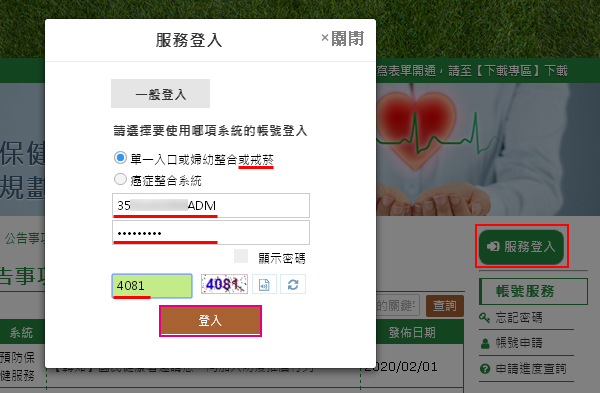 (一)於網頁右邊點選「服務登入」,再點選「單一入口或婦幼整合或戒菸」,並輸入「戒菸服務系統」帳號、密碼登入。