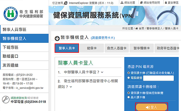 步驟一、開啟健保資訊網服務系統(VPN):申請作業限以負責醫師之醫事人員或健保卡憑證登入