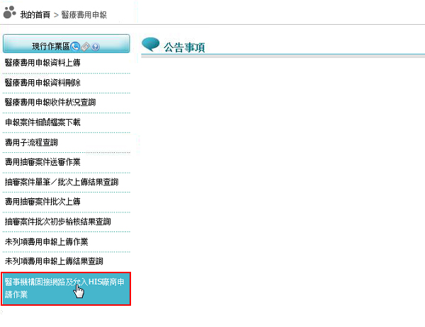 步驟二、登入成功後,點選「醫療費用申報」之「醫事機構固接網路及允入HIS廠商申請作業」功能