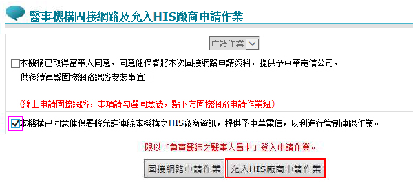 步驟三、勾選「本機構已同意健保署將允許連線本機構......」選項,再按下「允入HIS廠商申請作業」