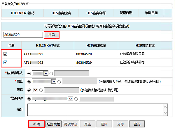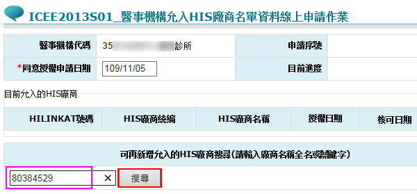 步驟四、於「可再新增允入的HIS廠商搜尋」項目下方空白欄位輸入「8038」再按下「搜尋」