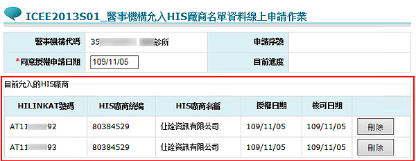 步驟六、於「目前允入的HIS廠商」會顯示新增成功的HIS廠商資訊,如下圖示