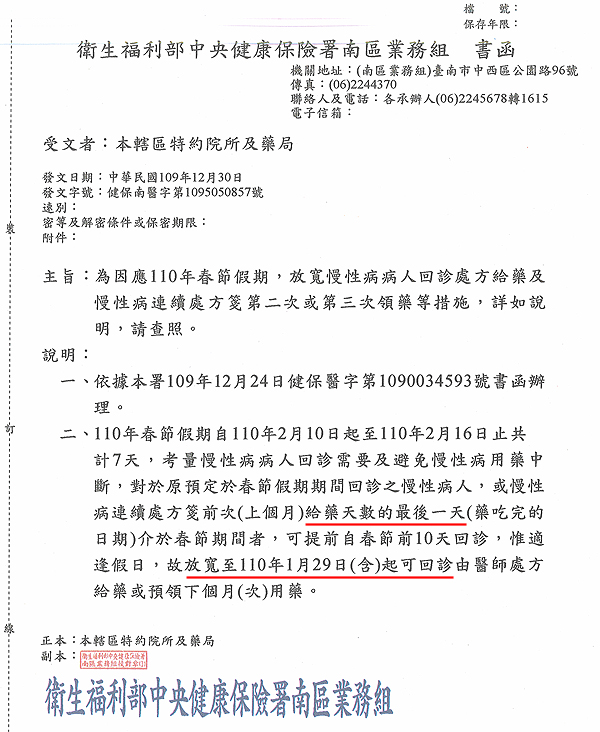 因應110年春節假期,放寬慢性病病人提前回診領藥等措施