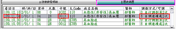 ● 掛號編輯畫面下方的歷史病歷區,可查閱病患是否有開立連續處方箋(會顯示綠色字樣)