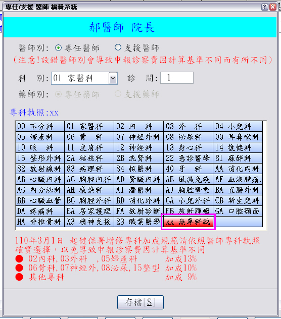 完整操作說明請參閱下列連結:門診診察費具專科執照加成及無專科執照申報如何設定