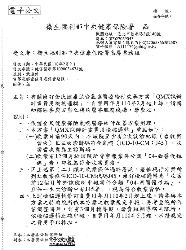 有關修訂氣喘QMX試辦計畫費用檢核邏輯,自費用年月110年2月上線