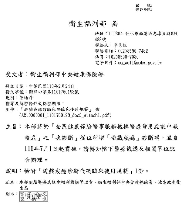 「全民健康保險醫事服務機構醫療費用點數申報格式」之「次診斷」欄位新增「遊戲成癮」診斷碼,並自110年7月1日起實施