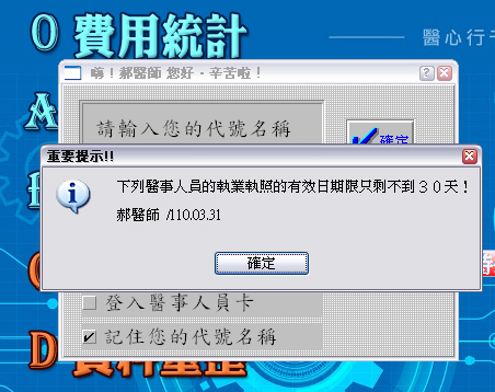 進入系統時,於設定人員執照期限到期前一個月即會跳出如下提示視窗