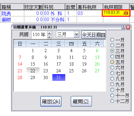 參數設定開啟後,於『C人事資料』內的「執照期限」輸入到期日後
