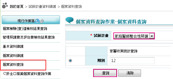 步驟二、「試辦計畫資料維護」項下點選『個案資料查詢』功能,右方畫面預設顯示如下圖