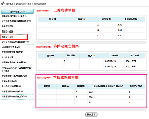 步驟三、查詢完成會顯示有上傳成功的筆數-院所收案醫師ID及個案類別ABC入檔成功筆數統計