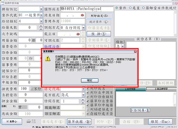 F3診療作業內,開立診斷或治療項目未符合規範時,於批價作業存檔時即出現提示視窗