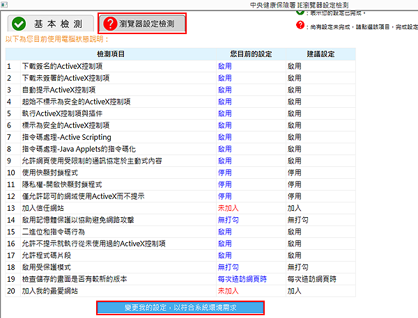 若出現紅色警示提示表示瀏覽器環境設定可能因微軟更新為預設狀態