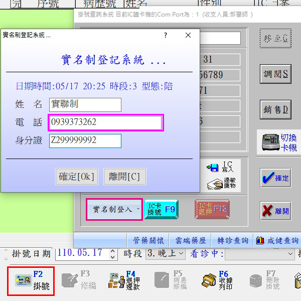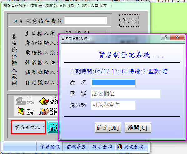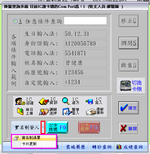 2、掛號作業內/F2掛號/增加『實名制登入』鈕,當日陪同就醫者可直接刷健保卡