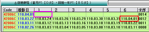 此狀況可能發生於院所習慣在執行復健療程終日(第六次:110.04.01)時,同時掛號看診取新卡序(0014)預開新復健治療項目,病患於不同日再執行首次療程。掛號人員若忘記將新卡序第一格【110.04.01】日期清空,則容易造成同日重複申報復健療程問題。